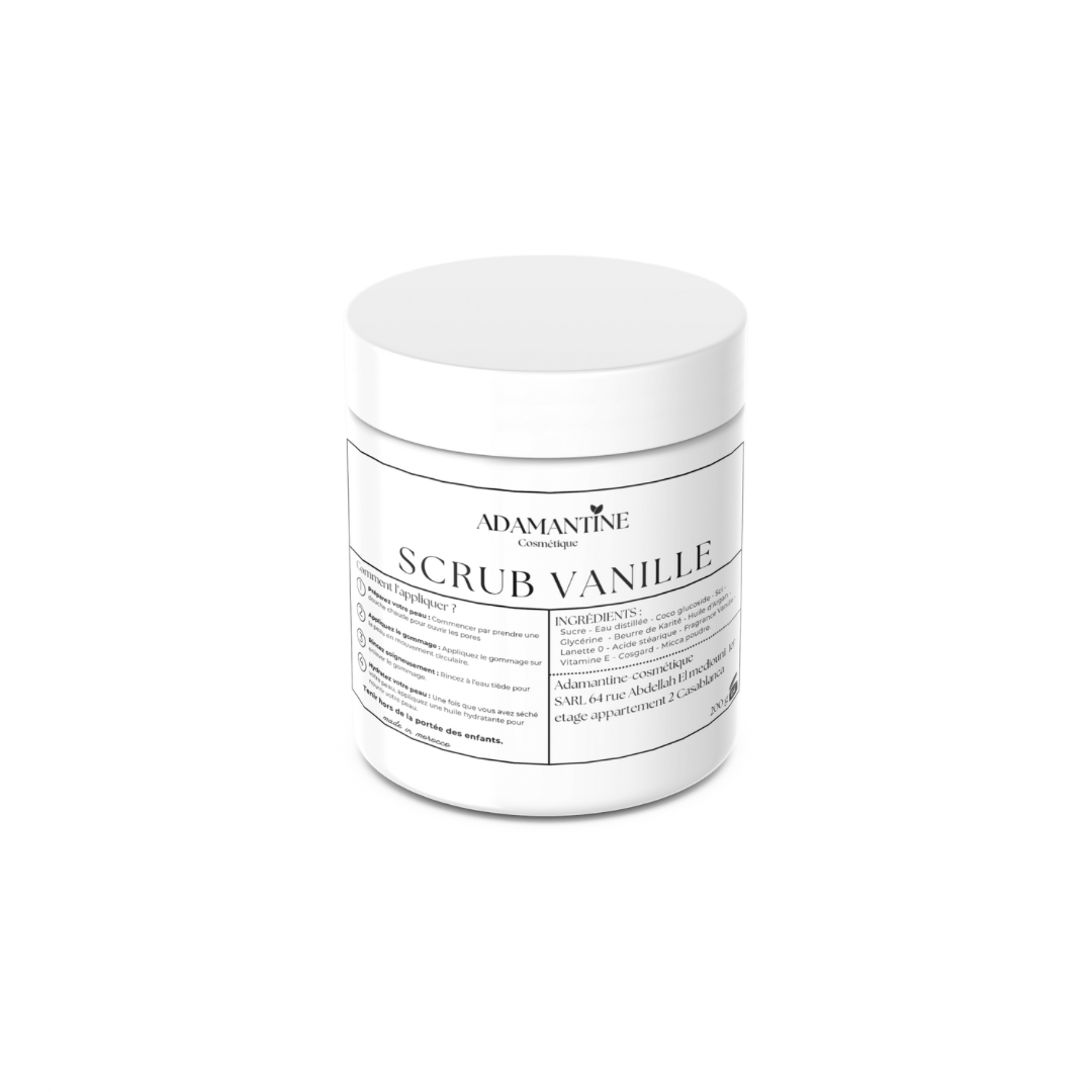 Ingredients: Sucre - Eau distillée - Coco glucoside - SCI - Glycérine - Beurre de Karité - Huile d’Argan - Lanette O - Acide stéarique - Fragrance Vanille - Vitamine E - Cosgard bio - Poudre Micca.